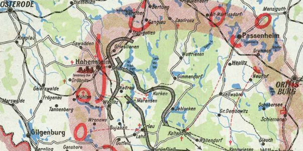 Карта района и схема событий битвы при Танненберге, напечатанная на немецкой открытке. На ней видны и Валлендорф, и Кинвизен — где-то между ними Философ Попов сотоварищи набрели на сотни сдавшихся в плен солдат и лес их штыков