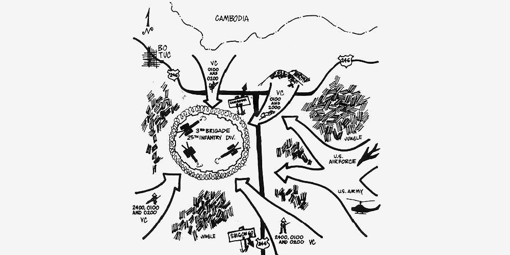 К 2:30 рота «Чарли», на которую пришёлся основной удар, доложила о потере половины состава. Примерно в это же время с воздуха на вьетнамцев посыпались кассетные бомбы и напалм. А с тыла оборону поддерживали бронетранспортёры. Высадили бы и десант с вертолётов — да в темноте не рискнули.