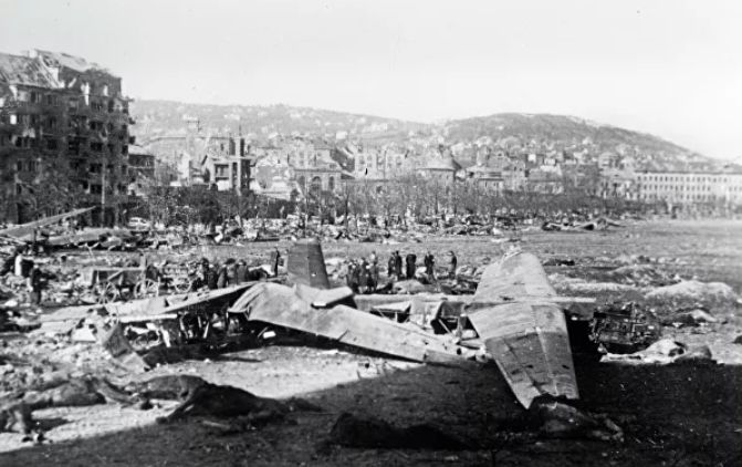 Планеродром немцев на площади Вермезе в Будапеште после штурма. Фотография из архива Павла Лукницкого