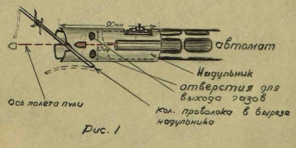 Надульник представлял собой трубку из кровельного железа длиной восемь-девять сантиметров и диаметром 3,5–3,7 сантиметра. По бокам в ней сделали отверстия для выхода газов, а спереди — четыре выреза для помещения колючей проволоки по оси полёта пули.