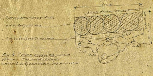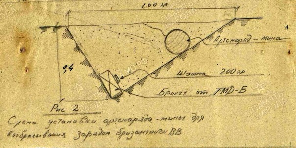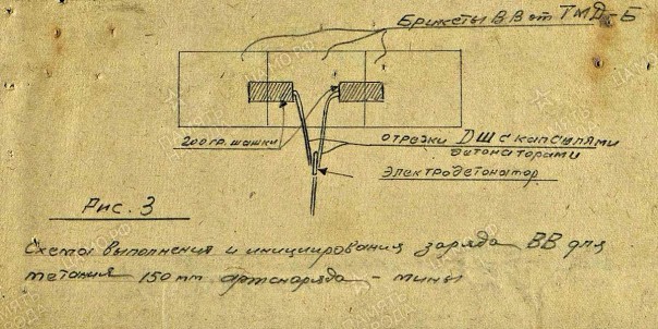 При этом штатный взрыватель заменяли электродетонатором замедленного действия. Ещё один детонатор — на этот раз мгновенный — вставляли в заряд для выбрасывания; для него обычно брали брикеты взрывчатки от мины ТМД-Б. Чтобы корпус метаемого снаряда не разрушился при взрыве, между снарядом и зарядом требовалось уложить прослойку из дерева или грунта толщиной в 20-30 сантиметров.
