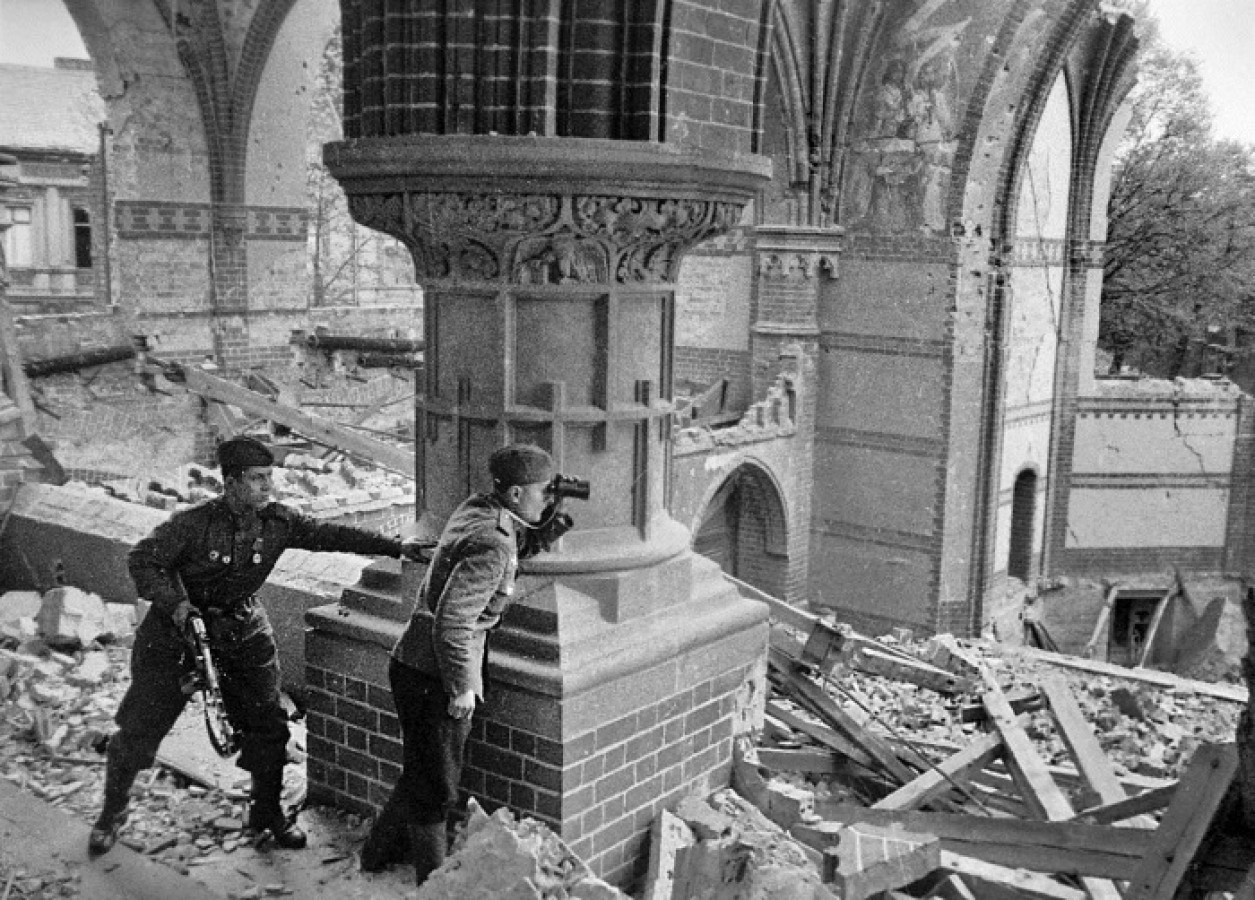 Советский офицер ведет корректировку артиллерийского огня на разрушенных улицах Берлина