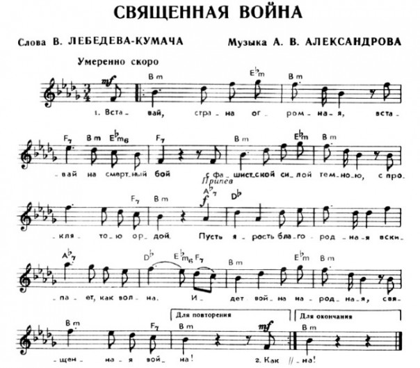В газете стихи прочитал руководитель Краснознамённого ансамбля песни и пляски Красной Армии Александр Александров. И в тот же день положил их на музыку. Еще день заняли репетиции, а уже 26 июня коллектив исполнил «Священную войну» на Белорусском вокзале, с которого советские солдаты отправлялись на фронт.
