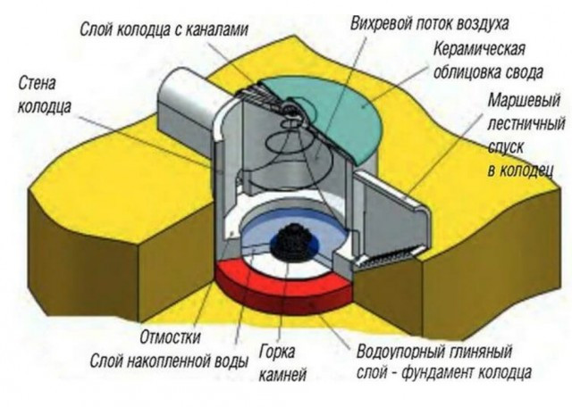 Это кажется невероятным, но древние инженеры использовали вихревой эффект при постройке колодцев. Сама конструкция снаружи напоминала небольшой шатер, выполненный из камня, и имела несколько отверстий. Более половины колодца было погружено в землю, а чтобы добраться до воды, приходилось спускаться вниз по лестнице. Благодаря специальной конструкции крыши и боковым отверстиям, через колодец постоянно циркулировал пустынный воздух, объемы которого, по оценкам специалистов, достигали нескольких тысяч кубометров в сутки.