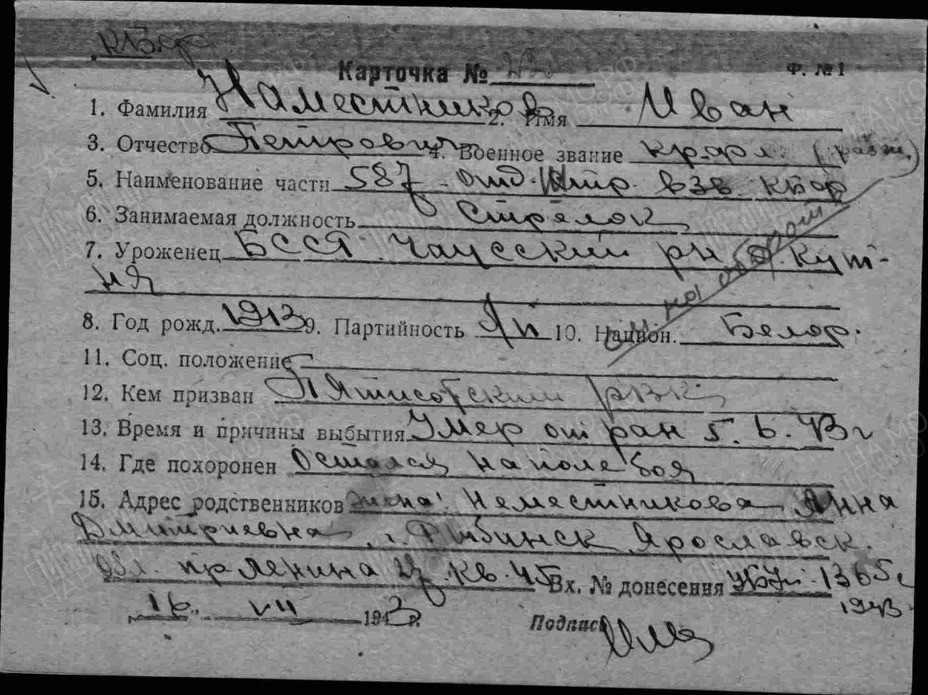 Карточка №22 из картотеки безвозвратных потерь с данными краснофлотца 587-го отдельного штрафного взвода КБФ Ивана Наместникова — участника группы захвата, действовавшей 5 июня 1943 год на участке обороны 4-го отдельного батальона 48-й отдельной морской стрелковой бригады. Наместников полностью искупил свою вину кровью: пытаясь вытащить с нейтральной полосы тела своих убитых товарищей, он был смертельно ранен и умер на поле боя.