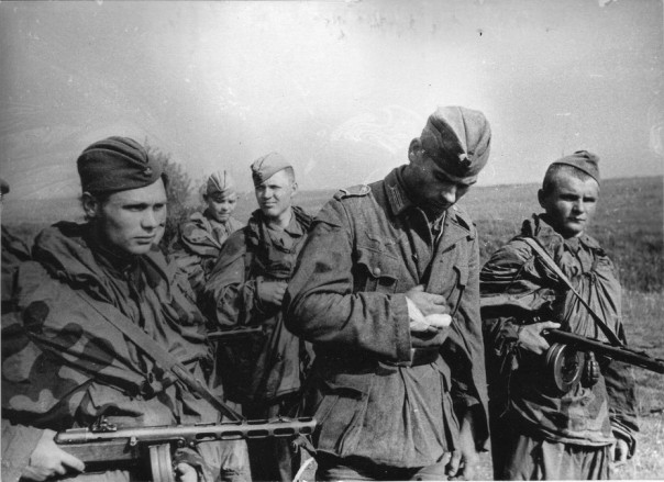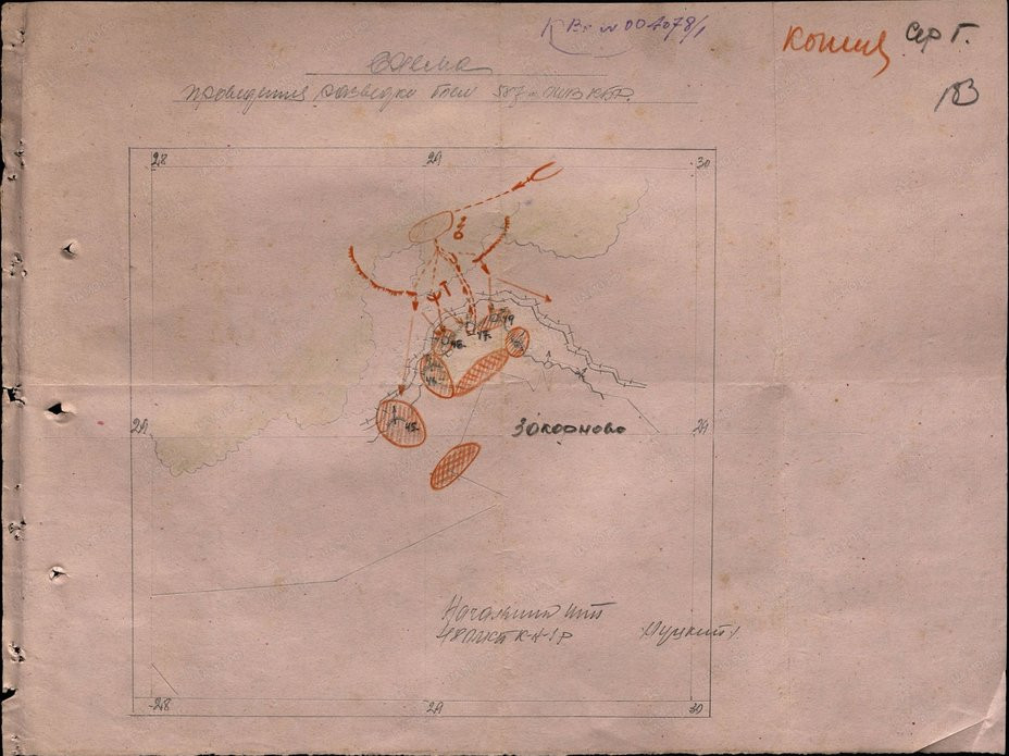 «где увидели спящими 4 чел. солдат. К/фл Кузнецов дал команду по-немецки «встать, поднять руки» и Петрову приказал вынести оружие из землянки. В это время зазвонил телефон и один из солдат пытался взять трубку, но Кузнецов не допустил его и сам обезвредил телефон. После этого стали выводить по одному из помещения и строить их у блиндажа на улице».
