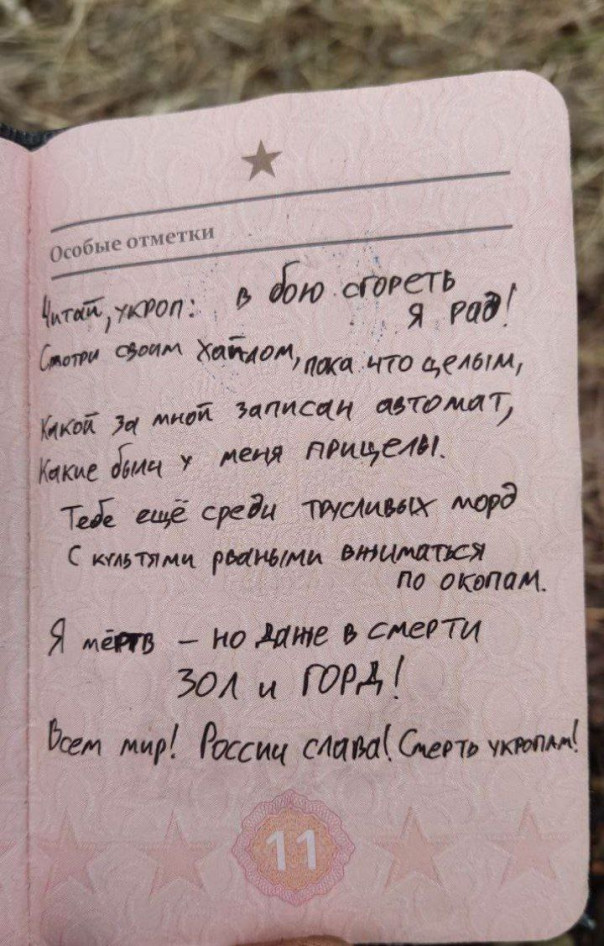 И русские воины не утратили силы духа и мужества. Героически стоят насмерть и на этой войне. Страница военного билета русского солдата, который бился до последнего.