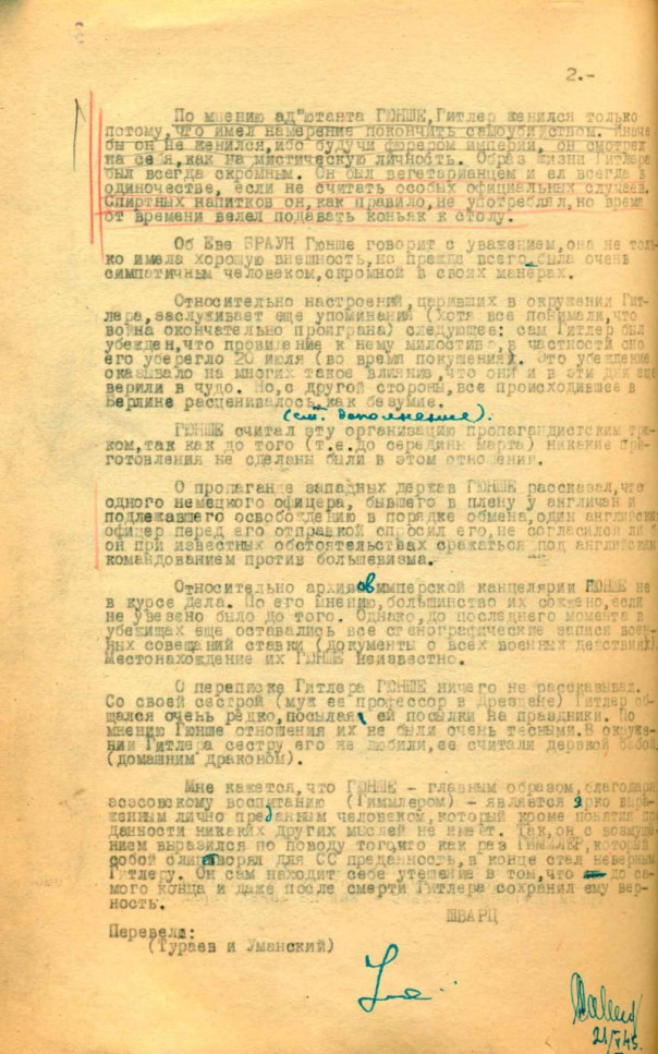Всех приближенных Гитлера, арестованных в мае 1945 года советской военной контрразведкой "Смерш", доставили в Москву, во внутреннюю тюрьму НКВД СССР. В их числе были и личный адъютант Гитлера – штурмбаннфюрер СС Отто Гюнше.