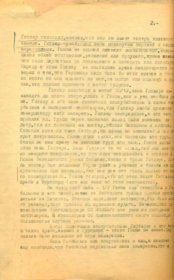СБ опубликовала новые архивные документы, касающиеся обстоятельств самоубийства лидера Национал-социалистической рабочей партии Германии Адольфа Гитлера и уничтожения его тела подчиненными фюрера в конце апреля 1945 года.