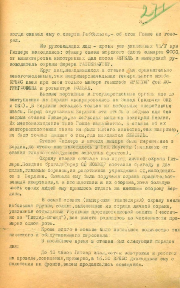 Шварц пересказывал распорядок дня в "фюрербункере" в последние дни нацистского режима: "До 13 часов Гитлер спал, затем завтракал и работал на проводе, совещания. Примерно в 16:30 (начальник штаба сухопутных войск — Прим. ред.) Кребс докладывал ему о положении на фронте, затем продолжались совещания".