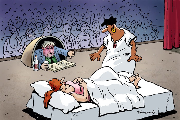 Приезжает известный актер в провинциальный театр — играть Отелло. А Дездемона — юная дебютантка. Она, естественно, волнуется. И вот подходит дело к сцене ее убиения, она целомудренно лежит в кровати под балдахином, но... ногами не в ту сторону! Открывает Отелло с одной стороны балдахин — а там ноги. Ну что поделать, закрывает, томно изображает задумчивость. А Дездемона осознает, что лежит не в том направлении, и переворачивается. Открывает Отелло балдахин с другой стороны, а там... опять ноги!