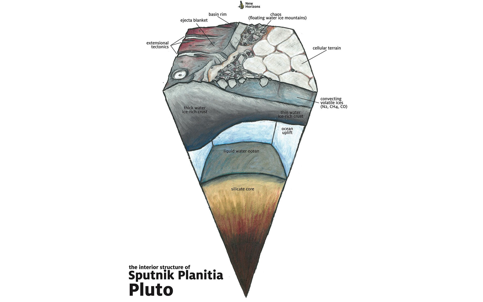 Дело в том, что равнина Спутник, как показало исследование её рельефа, образовалась в результате падения крупного астероида. После него большое количество расплавленного материала быстро поднялось с глубины вверх и образовало более плотную область в районе бывшего кратера. Затем поднявшийся материал замёрз. Однако быстрый подъём воды с глубины был бы невозможен, если бы там был только лёд: удар астероида не мог бы быстро расплавить всю ледяную "магму".