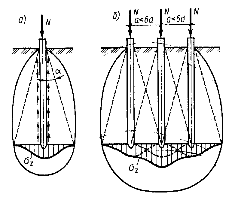 На схеме показаны расчётные эпюры напряжений (А) и реальные (Б). Видно, что каждая вторая свая фактически "висит" в воздухе, не только не совершая полезной работы, но, наоборот, дополнительно нагружая соседние.