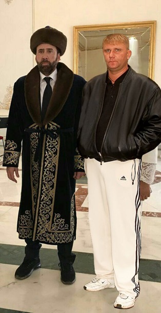 В Астане Кейдж сфотографировался в национальном костюме Казахстана. Снимок разлетелся по соцсетям, а сам актер стал героем фотожаб.