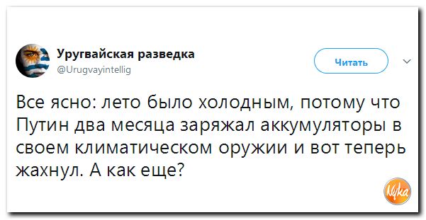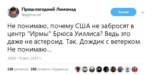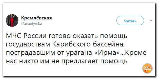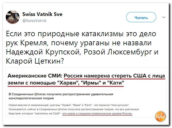 16. США заявили, что череда ураганов - это русское климатическое оружие. Русские отвечают: нет, это не мы. Нам было не до этого. В это время мы организовывали вспышки на Солнце и взорвали сверхновую в созвездии Пегаса.