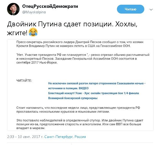 - Ну ты встал с последней чаркой самогона. И говоришь: «Ну, за Путина!»