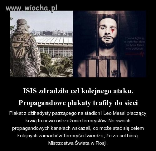Плакат с джихадистом, смотрящим на стадион, и Лео Месси, плачущим кровавыми слезами – это новое предостережение террористов. На своих пропагандистских каналах они указали, что может стать целью очередных терактов. Террористы утверждают, что они избрали целью ЧМ в России.
