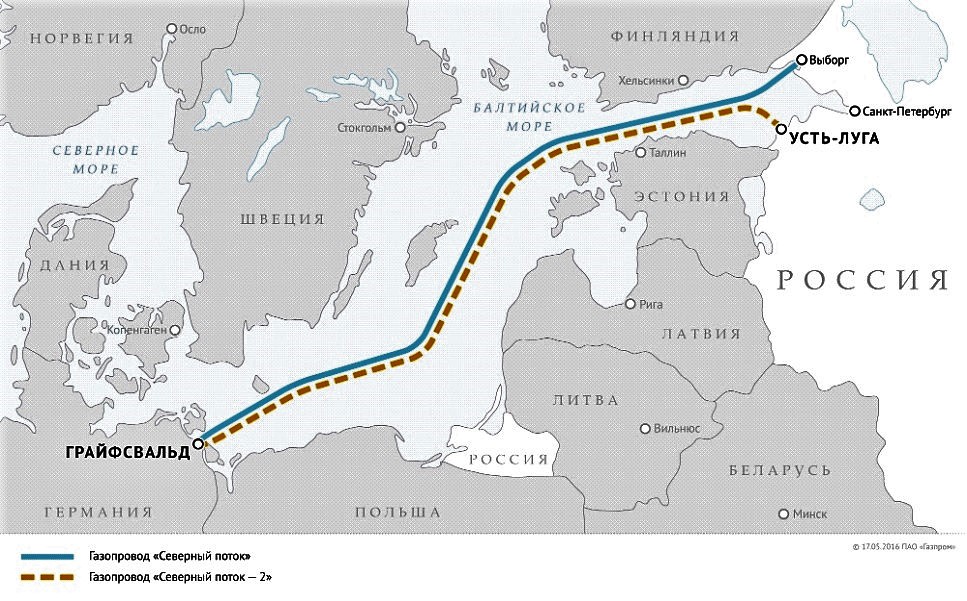 А теперь посмотрите, как проходит маршрут обоих Северных потоков, СП-1 и СП-2: