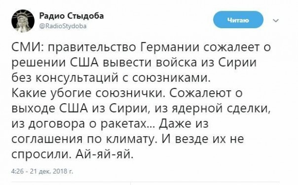 В эфире "любимого" американским президентом канала CNN решение Трампа о выводе войск из Сирии назвали "новогодним подарком Путину". pic.twitter.com/q0nK8uKh58