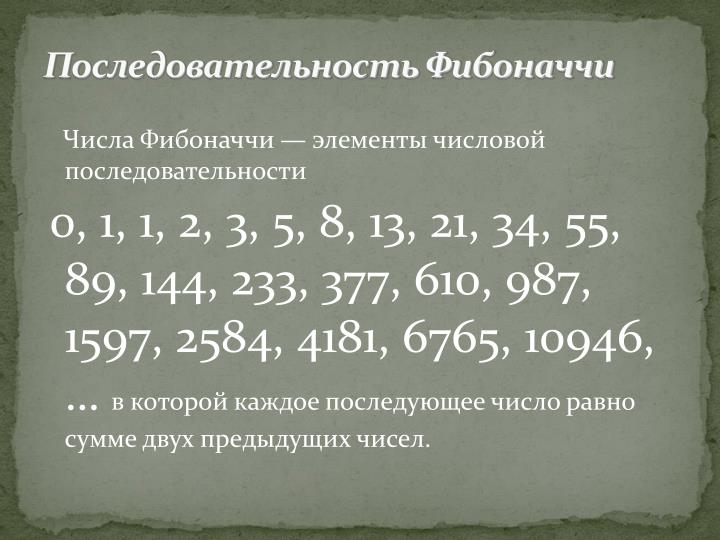 Итак, числа Фибоначчи (они же ряд Фибоначчи, или суммационная последовательность), это набор числовых значений, каждое из которых рекуррентно определяется как сумма двух предшествующих.