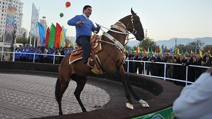 – А вот это – моя гордость, – продолжал Бердымухамедов. – Скачки в апреле 2013 года, где я на своем ахалтекинце Беркараре всех победил и взял главный приз. Ахалтекинцы – это наша гордость. Я так и озаглавил один из своих научных трудов: "Ахалтекинцы – наша гордость и слава". Я ещё написал работы "Стремительная поступь скакуна" и "У коня есть и преданность, и веселье".