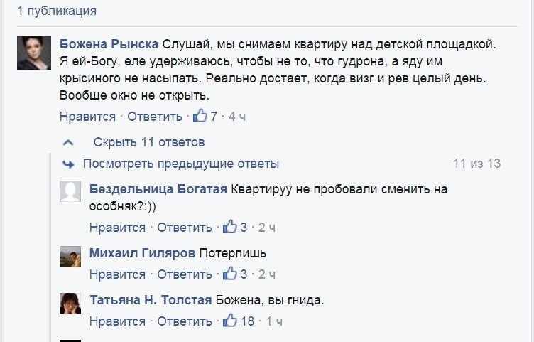 Детскую горку залили гудроном, и я этих граждан очень хорошо понимаю. Мы второпях снимали квартиру, нас с кошкой никто не брал на полгода, пришлось снимать на верхнем этаже прямо над детской площадкой. Это, товарищи, ад. Дети начинают реветь и визжать с 10 утра до 22-00. Последние вопли заканчиваются в 22-00, и потом, к полночи, на площадку выкатывается гопота, и вопли возобновляются, только пьяные. Сосед не выдержал и подрался с гопниками на той неделе. Потому что полицию вызывать бессмысленно. Они дожидаются, когда полиция уедет, и возвращаются. Сосед бизнесмен средней руки с собачками, не гопник. Не выдержал.