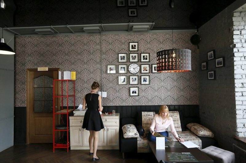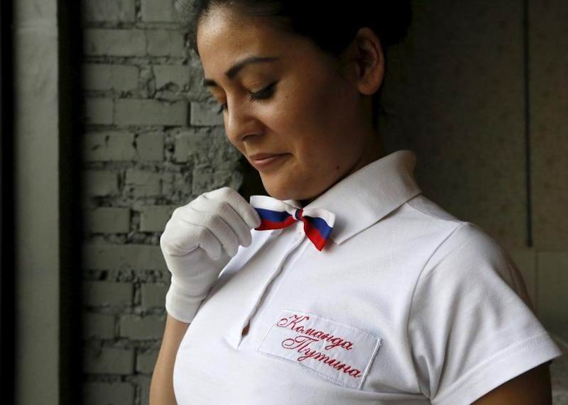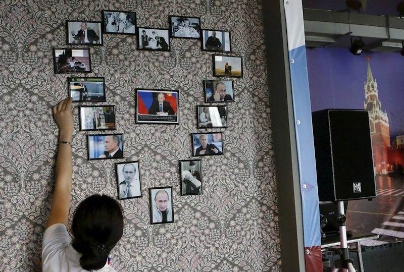Официанты тут носят форму с короткими перчатками, бабочкой цвета российского флага и надписью «Команда Путина». На зеркалах Путин также имеется.