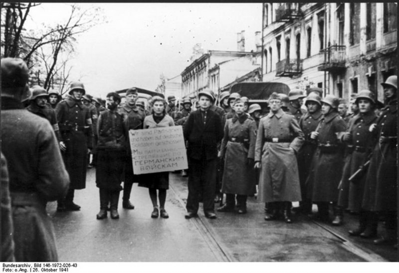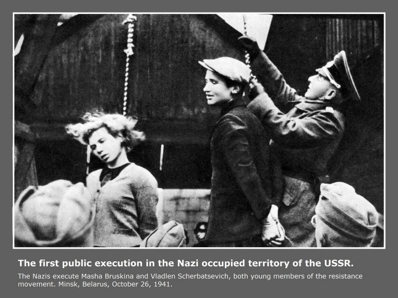 Девушка которую заставили нести плакат - Мария Брускина. На фото ниже: нацисты публично казнили Машу и её соратника
