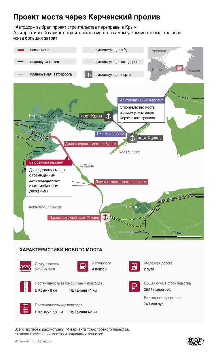 "Крымский мост возводится одновременно на 8 участках. Для организации строительства создана вся необходимая вспомогательная инфраструктура: подъездные пути, складские площадки, бетонные установки, вахтовые городки со стороны Керчи и Тамани", — говорится в сообщении.