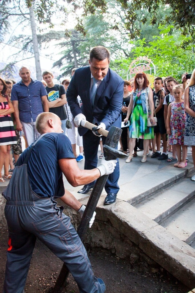 Глава администрации Ялты Андрей Ростенко вбивает гвоздь в знак открытия памятника блэкауту в сквере имени Калинина