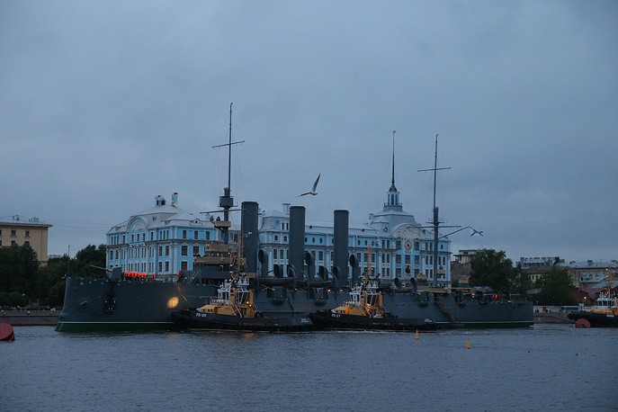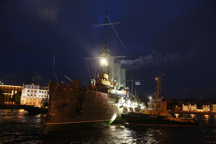 Переход "Авроры" оказался ярким зрелищем: в навигационных сумерках крейсер прошел по Морскому каналу и по Неве с полной иллюминацией, включив мощный прожектор для освещения фарватера. На крейсере первого ранга, имеющем статус корабля номер 1 ВМФ России, поднят Андреевский флаг, на палубе выстроен экипаж.