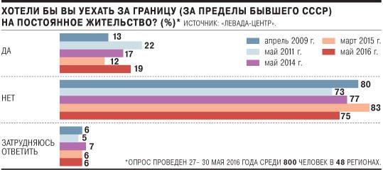 Почти каждый пятый россиянин хотел бы эмигрировать за пределы бывшего СССР, выяснил "Левада-центр". Задумывались об эмиграции 25% граждан. Главные причины этого — "лучшие условия жизни за рубежом" и нестабильная экономика России. Социологи считают, что данные отражают не реальное желание определенных групп граждан уехать, но их недовольство ситуацией в стране.