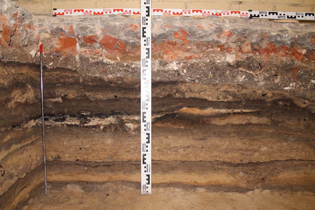 Стратиграфический разрез. Видна прослойка пожара середины XIII века.