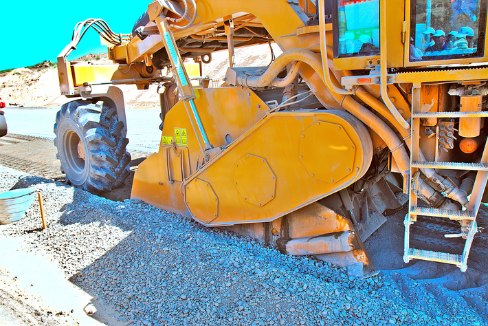 За ней идет другая машина — ресайклер, которая снимает слой щебня с цементом и верхним слоем местного грунта, добавляет воду или битумную эмульсию, перемешивает и укладывает обратно.