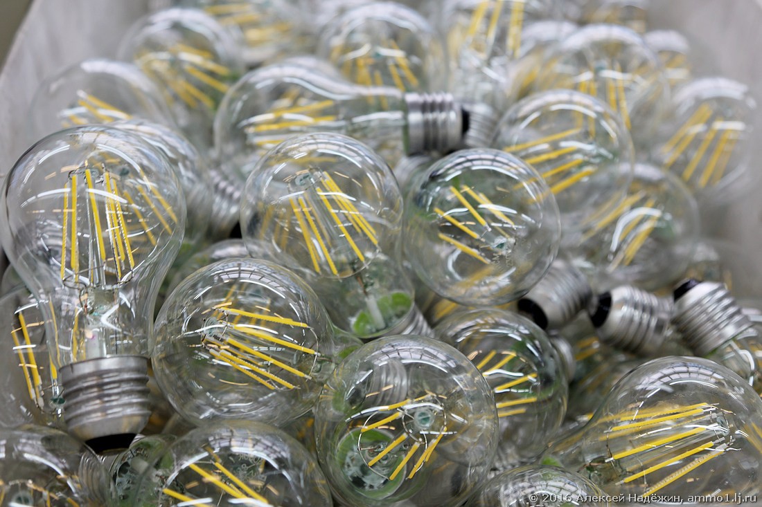 Светодиодные нити — основа филаментной светодиодной лампы закупаются в Китае. А вот на ножку их приварили руки российских работниц.
