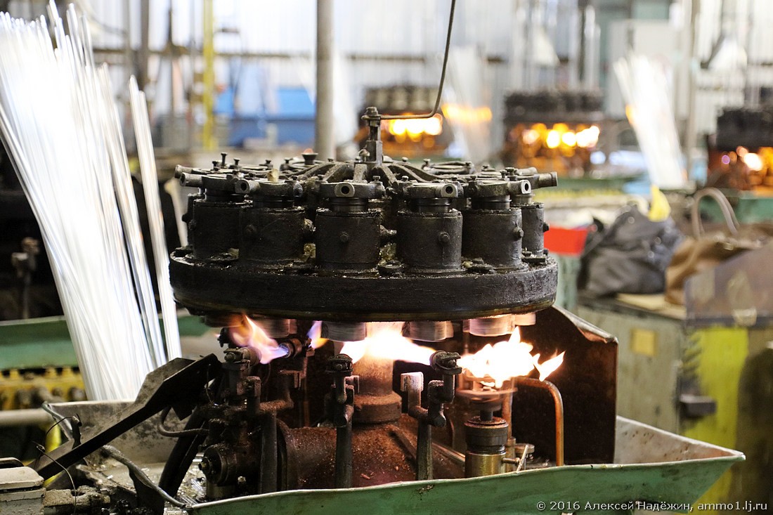 Дальше трубку разрезают и из этих отрезков делают ножки и колбы ламп.