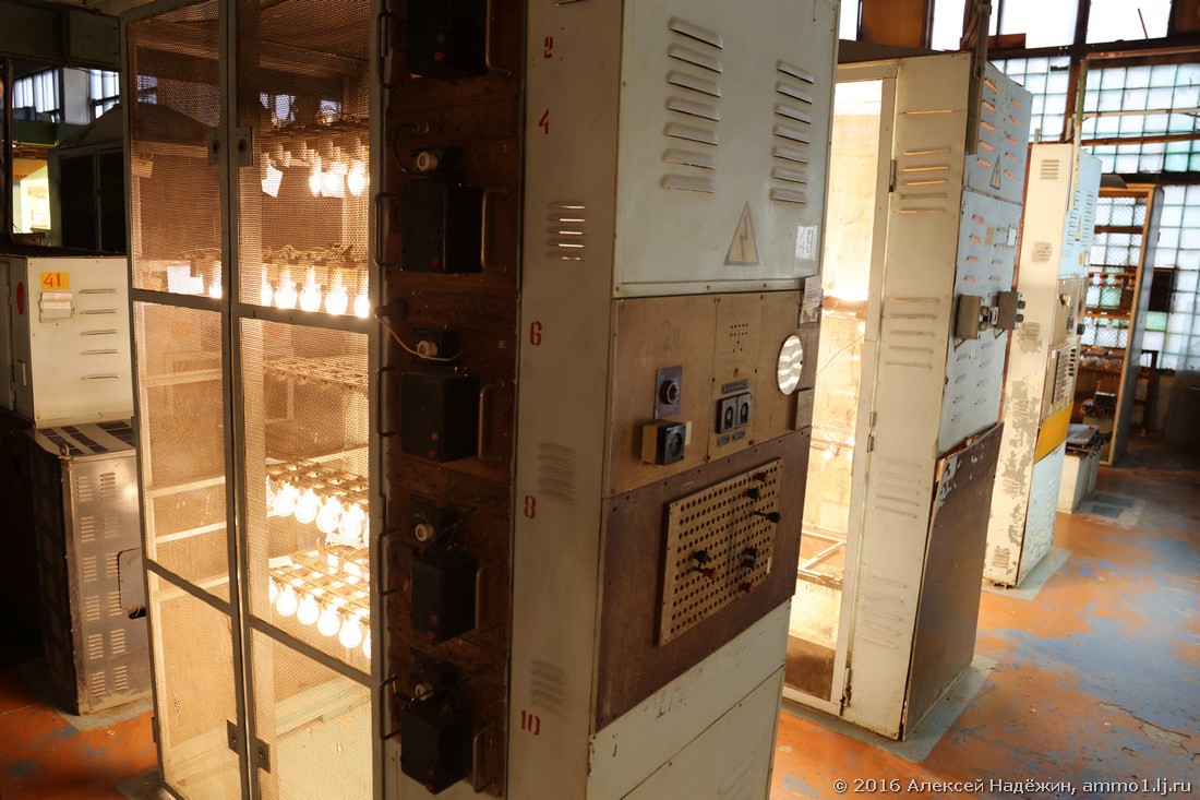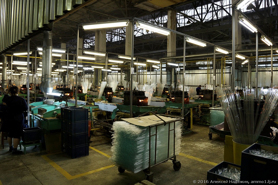 Мощности завода позволяют не только использовать своё стекло, но и снабжать им другие ламповые заводы, у которых нет своего стекольного производства. Заготовки ждут отправки, процессом руководит Самый главный в горячем цехе. Вы его заметили?