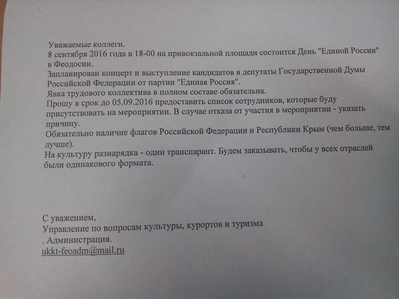 Широкий резонанс вызвала запись в Facebook кандидата в депутаты Госдумы Александра Талипова: политик рассказывает о том, как власти Феодосии сгоняют бюджетников на акцию «Единой России». Свои слова Талипов подтверждает фотографией письма Управления по вопросам культуры, курортов и туризма местной администрации.