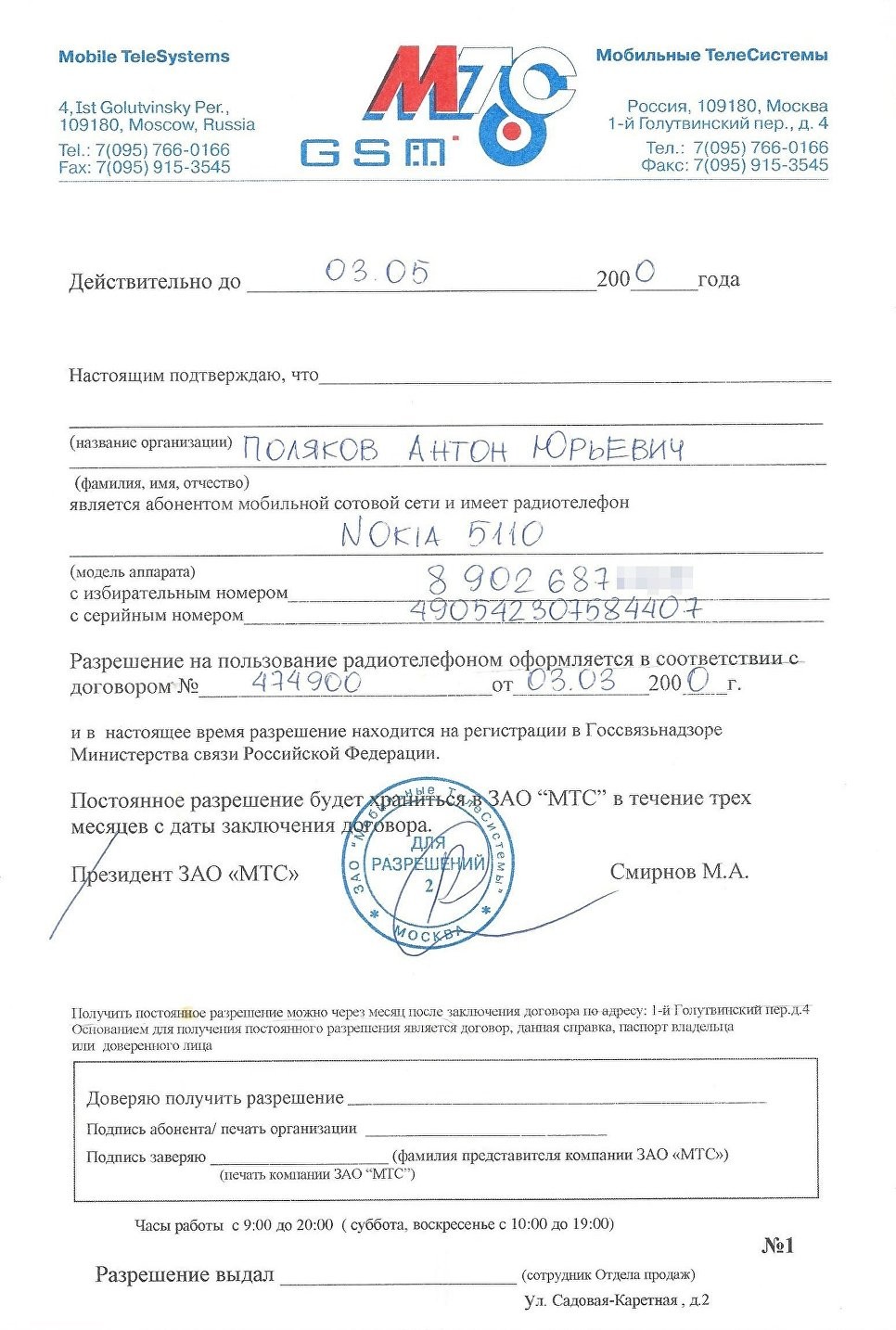 Вплоть до лета 2000 года для пользования сотовым телефоном требовалось разрешение от Госсвязьнадзора. При заключении контракта с одним из операторов выдавался документ, свидетельствовавший о том, что разрешение находится на стадии оформления.