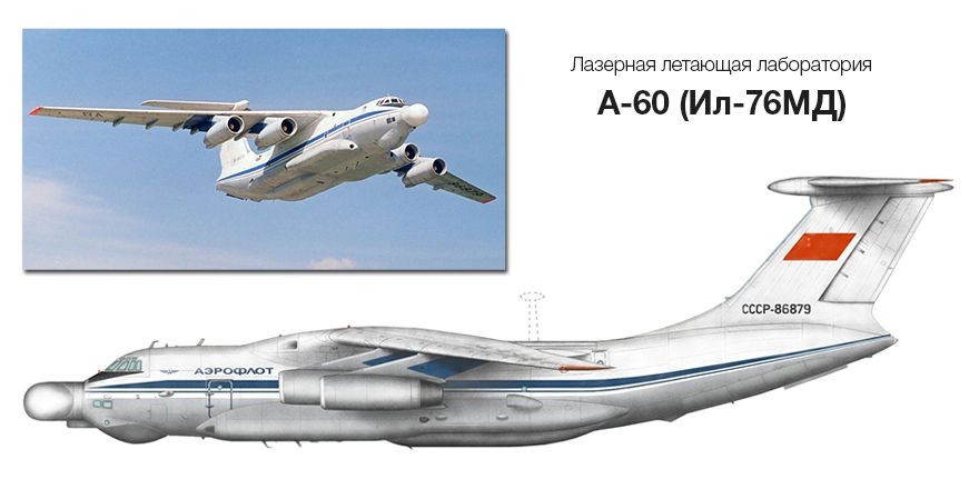 Для исследований свойств лазера в воздухе был необходим надёжный и вместе с тем вместительный самолёт, способный перевозить не только сам лазер, но и энергетическую установку к нему. За основу летающей лаборатории с лазером А-60 был взят транспортный Ил-76МД, который, тем не менее, претерпел целый ряд серьезных изменений, обусловленных размещением «специального оборудования». Основной проблемой для лазера «воздушного базирования» стала всё та же нехватка энергии. Самолёт был доработан: для питания лазера и сопутствующей аппаратуры в обтекателях по бокам фюзеляжа установили дополнительные турбогенераторы. Для этого пришлось перенести ВСУ, доработать двери и убрать передние аварийные выходы. В носу вместо штатного радара был установлен большой обтекатель, к которому снизу крепился обтекатель поменьше. Вероятно, там разместили подвижную антенну системы наведения с круговым обзором.
