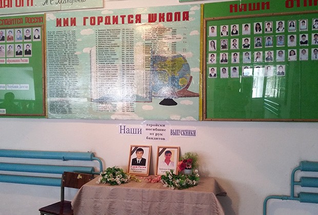 О том конфликте во второй школе — ныне лицее имени С.Г. Абдуллаева — не помнят. «Магомед в 2002 году выпустился, сколько времени прошло», — говорит Ильяс Магомедов, директор лицея. А вот о самом Нурбагандове вспоминают более чем охотно. Портреты братьев Магомеда и Абдурашида стоят в школьном фойе: «Наши геройски погибшие от рук бандитов выпускники». «Лучше всех стометровку бегал», — вспоминает директор Ильяс Расулович, учивший Нурбагандовых физкультуре.