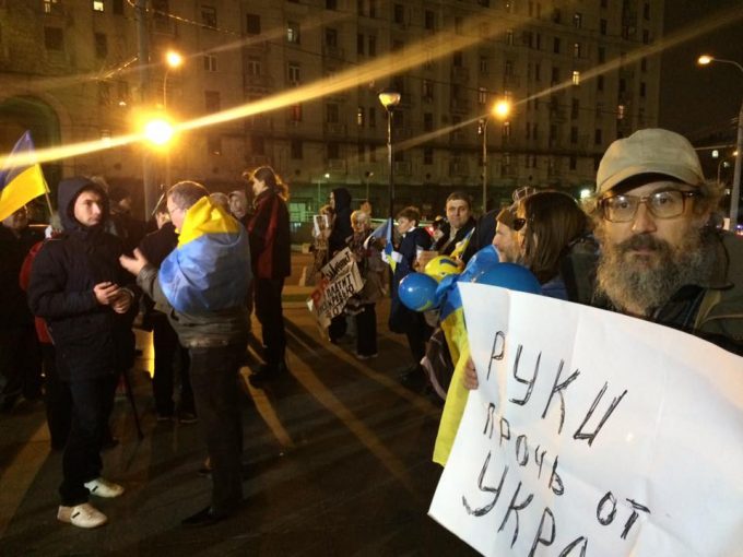 Пикет в поддержку Украины прошел сегодня в Москве. На него вышли около 15 человек с украинскими и крымско-татарскими флагами и лозунгами: «Руки прочь от Украины», «Россия по уши в этой войне», «Путин, вон из Украины» и другими.