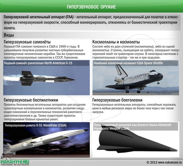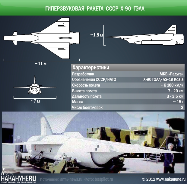 Проекты аппаратов, способных в 5–7 раз превышать скорость звука, разрабатывались в СССР и США параллельно начиная с 80-х годов. СССР успел первым: гиперзвуковой экспериментальный летательный аппарат (ГЭЛА), он же Х-90 был создан МКБ "Радуга" уже в конце 80-х, но в 1992 году проект по понятным причинам был закрыт. От него остался макет, который несколько раз зачем-то выставляли на МАКСах в Жуковском, хотя никаких работ по теме не велось вплоть до нулевых годов.