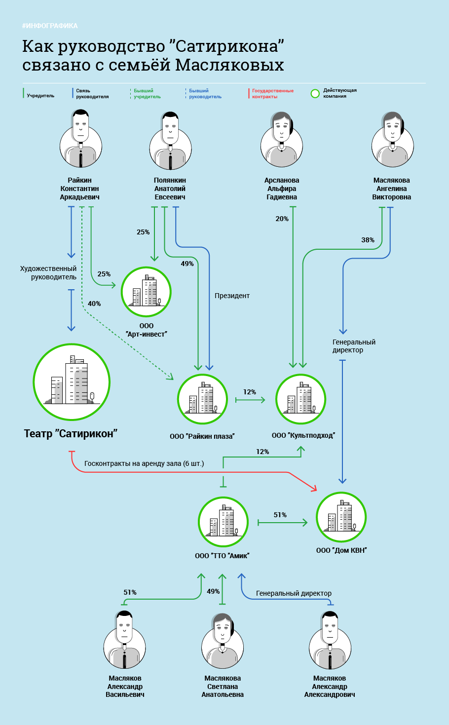Намедни глава театра «Сатирикон», народный артист России, профессор Константин Райкин рассказал широким массам о полном цензурном беспределе в стране и о том, что мы все «клевещем, доносим. И опять хотим в клетку». Однако, как вскоре выяснилось, что вся эта революция упиралась в денежный вопрос, который вскоре был успешно решен на переговорах с министром культуры Владимиром Мединским, который тоже не меньше профессор, чем Райкин. Казалось бы, встретились мирно трое – два профессора и один российский бюджет – по-тихому перетерли и закрыли тему, позабыв и про цензуру, и про клетку. Однако, коллеги из «Лайфа», привлеченные выступлением Константина Райкина, по ходу пьесы обнаружили удивительный факт – оказывается, за период с 2015 года 86,5 млн рублей, полученных театром «Сатирикон» из российского бюджета, плавно утекли в распоряжение центра «Планета КВН», принадлежащего семейству Масляковых. Причем, как оказалось, директор несгибаемого Райкина Анатолий Полянкин связан совместным бизнесом с Ангелиной Масляковой - невесткой Александра Васильевича Маслякова, и другими структурами, принадлежащими семье Масляковых.