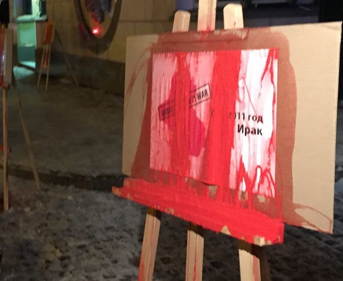 Кроме того, у здания посольства были установлены мольберты с табличками, покрытыми красной краской, символизирующей кровь. На них были указаны названия военных операций, в которых участвовали британские войска.