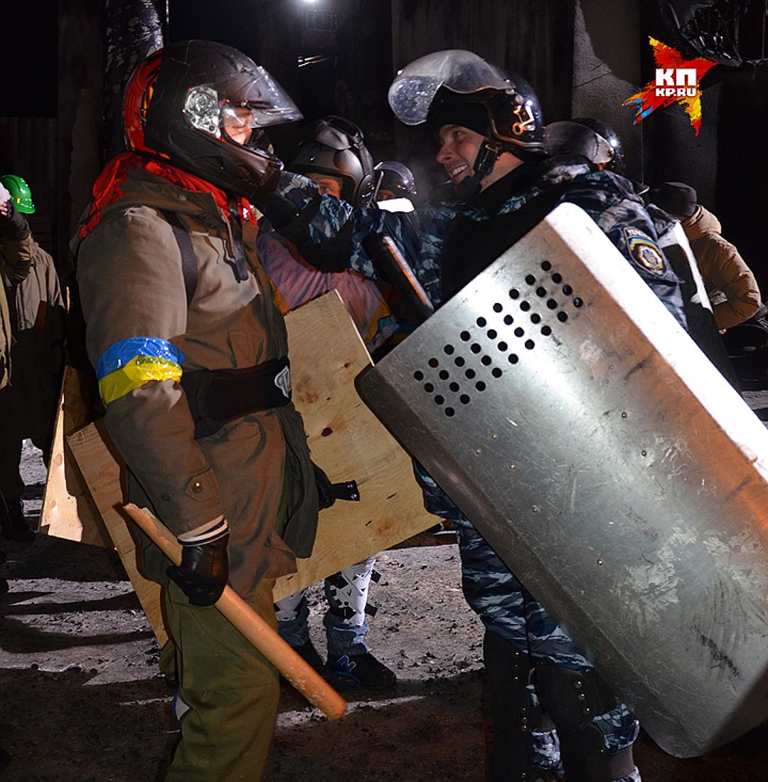 - Бью тебя по голове, а ты подставляешь щит, и в ответ - палкой в плечо, но не сильно, - предлагает человек-"фантик", обернутый в украинский флаг, актеру в форме бойца "Беркута".