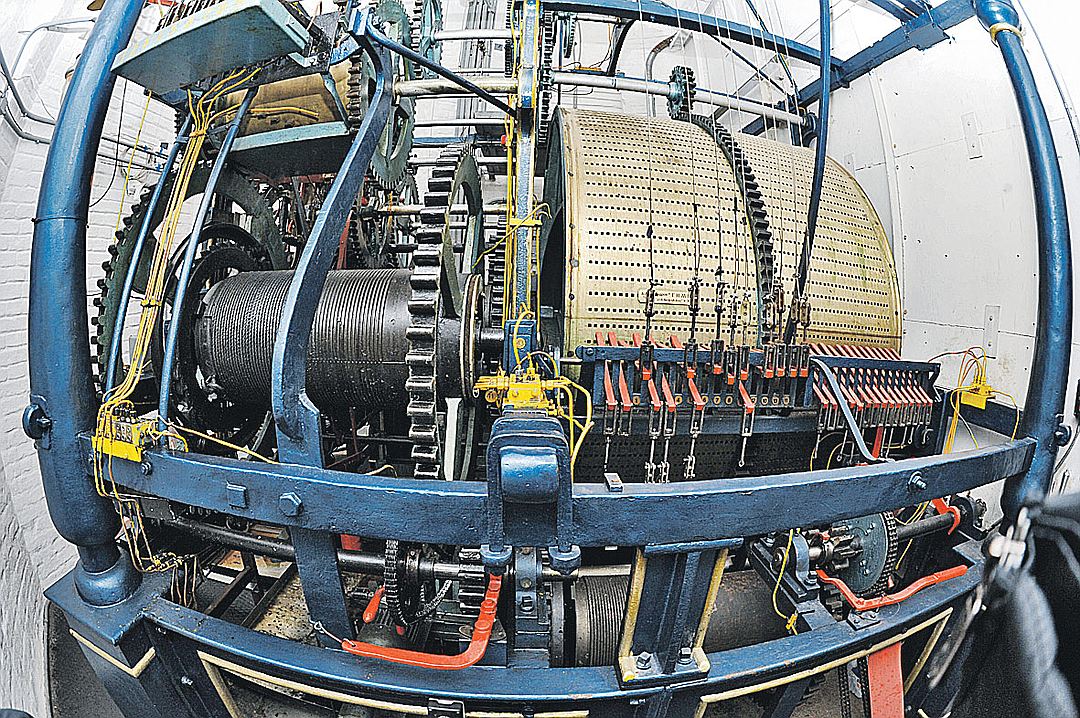 Музыкальный барабан (реконструирован в 1851-м, перенастроен в 1990 - 2000-е годы). На фото внизу видны тросы механизма привода колоколов, которые идут на звонницу.