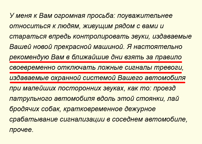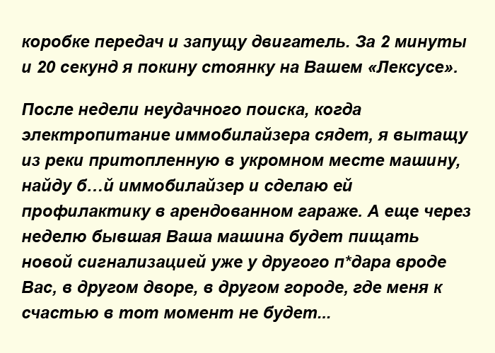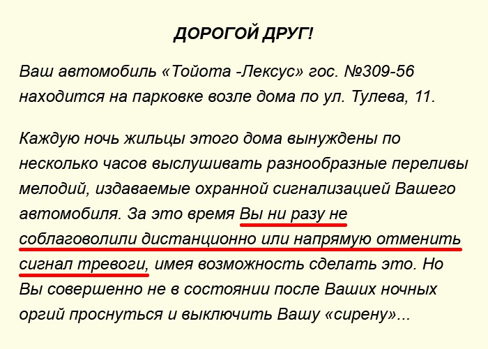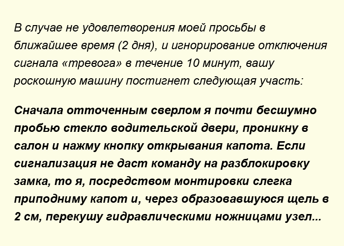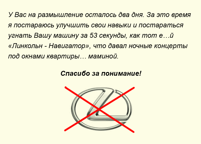 Эту записку принес в отделение полиции напуганный владелец Лексуса, обнаружив её на лобовом стекле своего автомобиля. В результате работа полиции была парализована до конца дня. Хохотали до упада всем отделением.