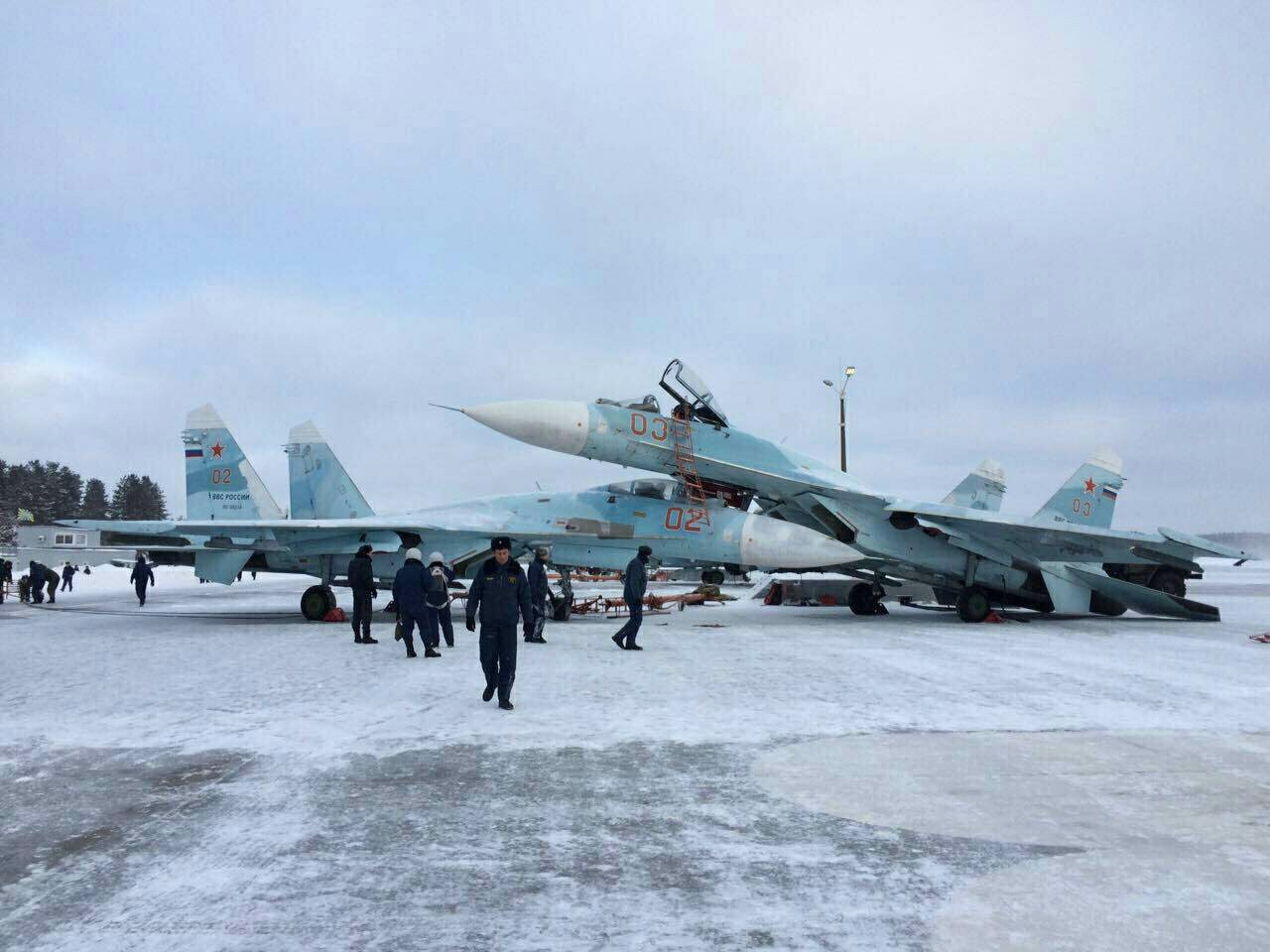 Фотография аварии двух истребителей Су-27СМ из состава 790-го истребительного авиационного полка 105-й гвардейской смешанной авиационной дивизии 6-й Ленинградской Краснознаменной армии ВВС и ПВО России, произошедшей 15 декабря 2016 года на аэродроме базирования этого полка Хотилово (Тверская область). Снимок уже некоторое время распространяется в социальных сетях, а теперь попал уже и в зарубежные СМИ. По неофициальным сообщениям, причиной столкновения стали ошибочные действия летчика истребителя с бортовым номером "02 красный", чрезмерно энергично работавшего РУДом при рулежке по аэродрому. Повреждения обеих самолетов неофициально называются "незначительными".