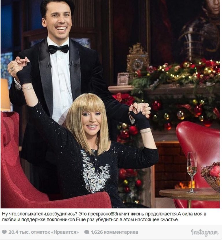 Глядя на Пугачёву в шоу Первого канала «МаксимМаксим», строящую новогодний выпуск на шутках о совместной жизни с Галкиным, понимаешь: кажется, она не имеет понятия о том, что действительно интересует зрителей, в последние годы активно высказывающих всё, что они думают, в Интернете. «Мытьё костей» на кухнях с успехом заменил «Фейсбук», где за один день сотни тысяч людей могут возмутиться тем, что ты делаешь, возвести в топы читаемых едкий критический пост и даже собрать против тебя петицию. У Аллы Пугачёвой и самой есть страничка в соцсети — модное веяние не обошло стороной 67-летнюю артистку. Но и там — полный отрыв от реальности.
